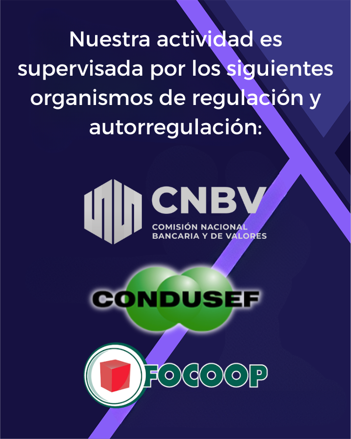 • Nuestras operaciones forman parte del Sistema Financiero Mexicano, en su apartado de organizaciones auxiliares del crédito, párrafo de Finanzas Populares. Nuestra actividad es supervisada por organismos de regulación y autorregulación, como la Comisión Nacional Bancaria y de Valores (CNBV), la Comisión Nacional para la Protección y Defensa de los Usuarios de Servicios Financieros (CONDUSEF) y el Fideicomiso Fondo de Supervisión Auxiliar de Sociedades Cooperativas de Ahorro y Préstamo y de Protección a sus Ahorradores (FOCOOP).